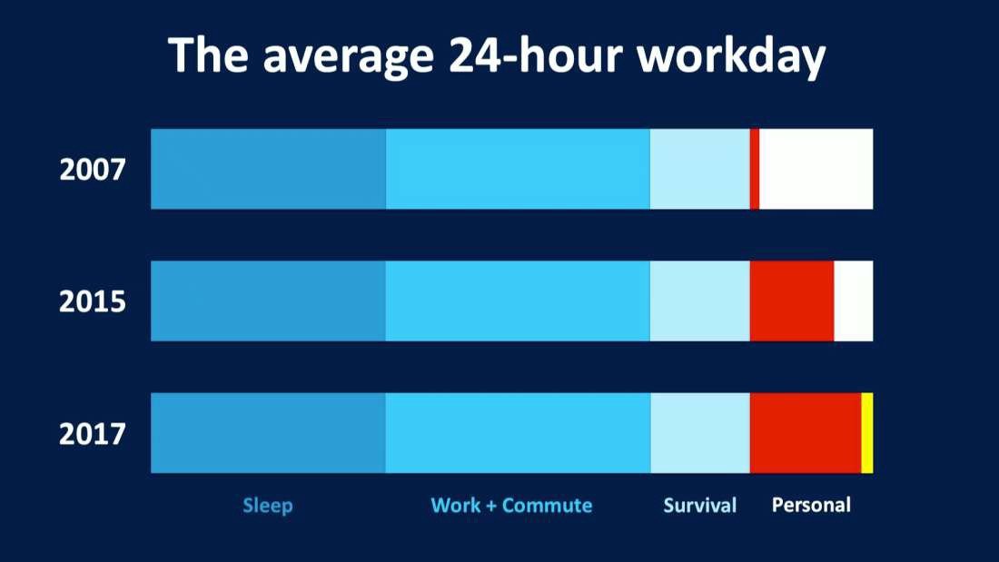 Whether we’ve hit the upper limit in time spent with Mobile or not is yet to be seen (Though there is only so much time in a day). To that end, a recent TED talk given by NYU professor of psychology Adam Alter shared research on the average 24-hour workday, focusing on how time was spent across four categories: Sleep, Work+Commute, Survival, and Personal. You can see the findings below. Note that within “Personal” is a red bar that represents screentime.