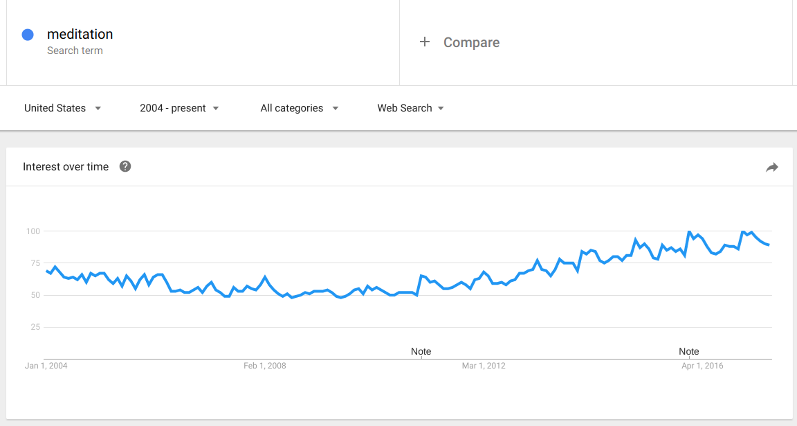 Interest in meditation appears to be on the rise. Take a look at this Google Trends for “meditation:”
