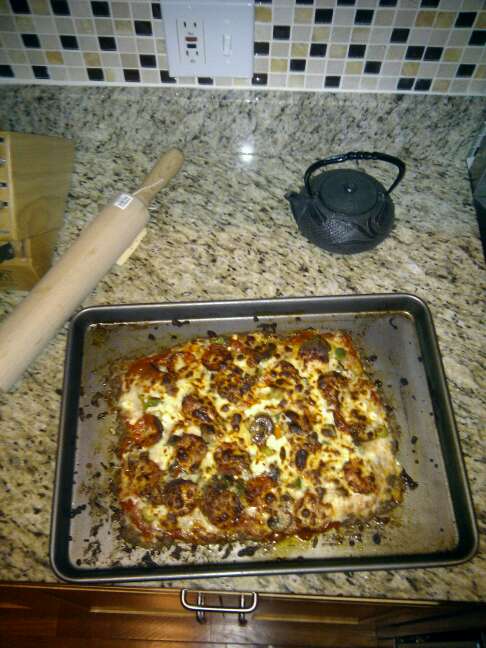 Broiler heated up, I throw it all back in the oven until the cheese is done. It cooks very fast at this point! Like five minutes is almost too long in our case, so make sure you keep a close eye on your meatza!
