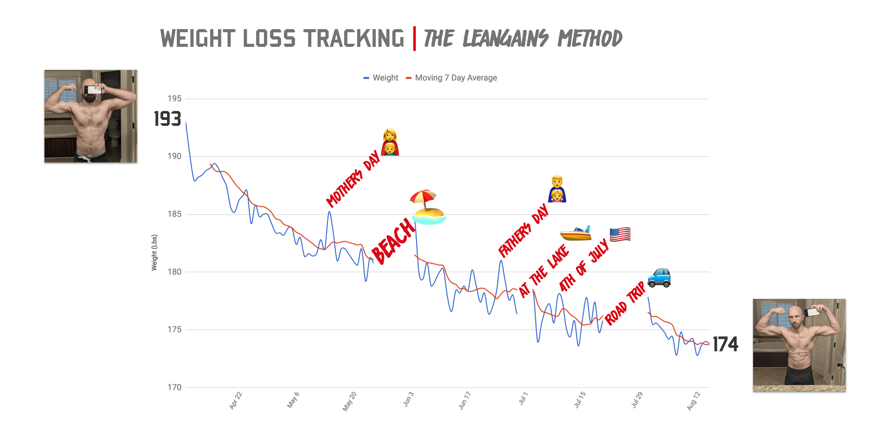 From there, you'll see minor blips but overall a consistent trendline as evidenced by the rolling seven day average. However, all the annotated bits—Mother's Day, beach vacation, Father's Day, 4th of July—they all were moments where my carb intake inevitably went up or I went to a more "maintenance mode" for my diet. In no way after any of these spikes did I do anything drastic: I just resumed the diet and boom 💥 the water weight fell right back off.