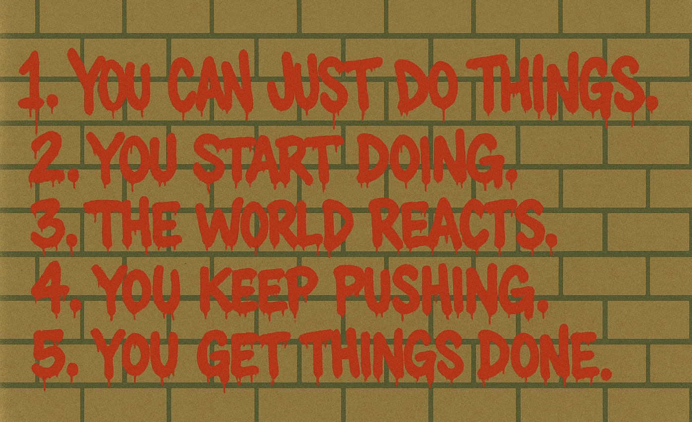 The lesson? Yes, you can just do things, but expect to hit walls. You must go full Kool-Aid Man, and smash through the brick with a grin and a shout: "Oh yeah!"